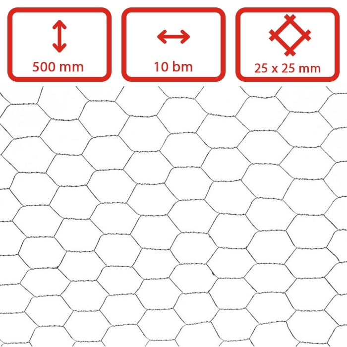 Pozinkované pletivo hexagonální - šestihranné. Velikost ok má 25 mm, výška pletiva je 500 mm. Pletivo dodáváme v rolích po 10 bm.
